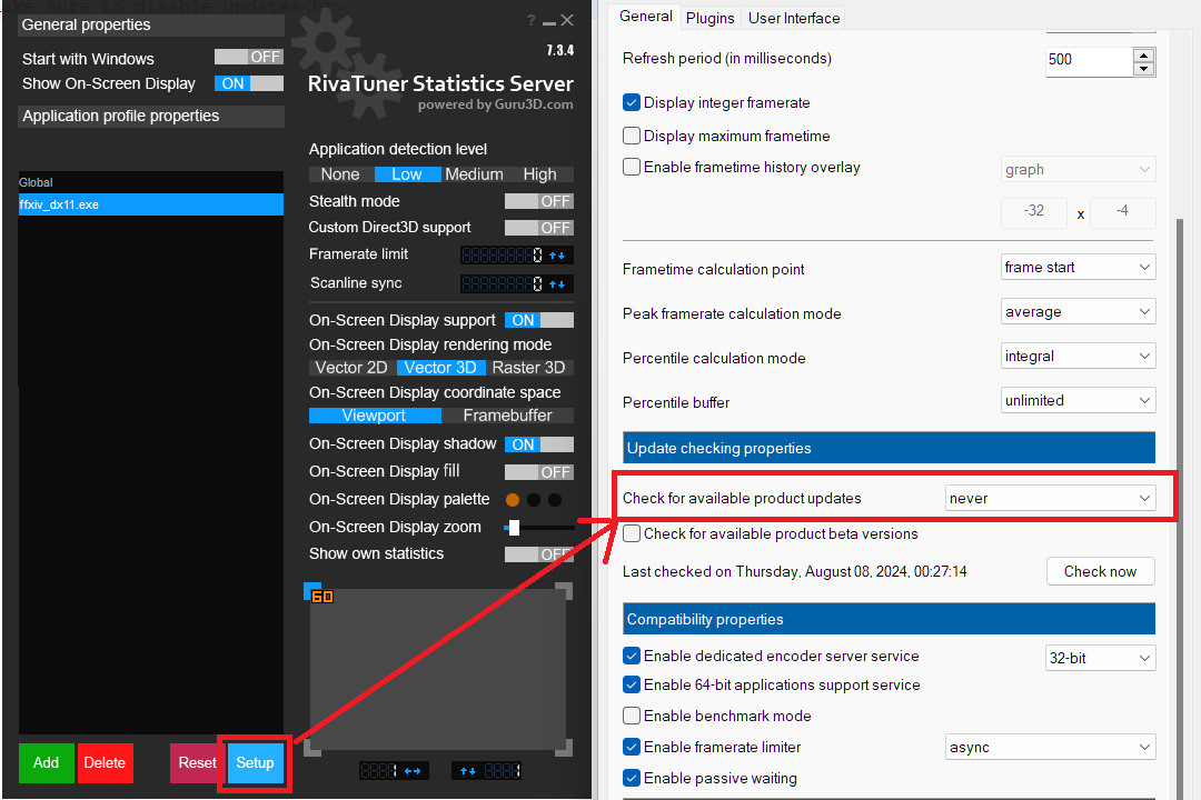 To fix RTSS incompatibility with Splatoon: - Download and install RivaTuner Statistics Server 7.3.4: (archive password: nightmarexiv); - After installing it, make sure to disable updates